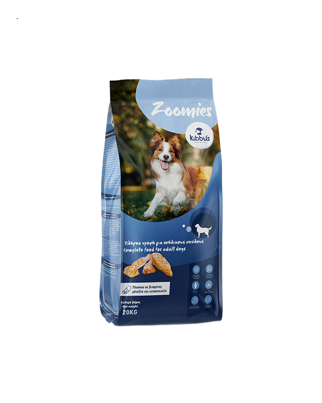 Zoomies është ushqim i plotë dhe i ekuilibruar për qen të rritur, i formuluar për të përmbushur nevojat ushqyese të përditshme.